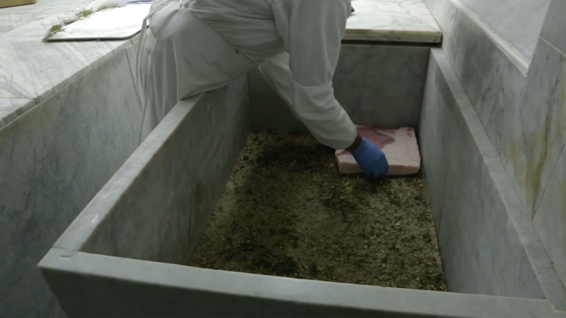 IL MARMO. Far stagionare il Lardo nelle sue pareti vive, che respirano, senza trasudare o assorbire, oppure usare recipienti inerti, di acciaio, legno o peggio di plastica, non è sicuramente la stessa cosa. Inoltre non tutto il marmo è uguale: bisogna saper scegliere quello giusto, cioè quello a grana fine nel bacino dei Canaloni di Colonnata.